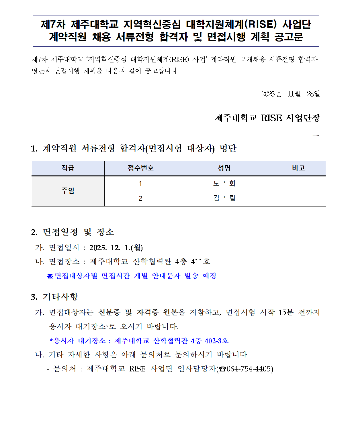 제7차 제주대학교 지역혁신중심 대학지원체계(RISE) 사업단 계약직원 채용 서류전형 합격자 및 면접시행 계획 공고