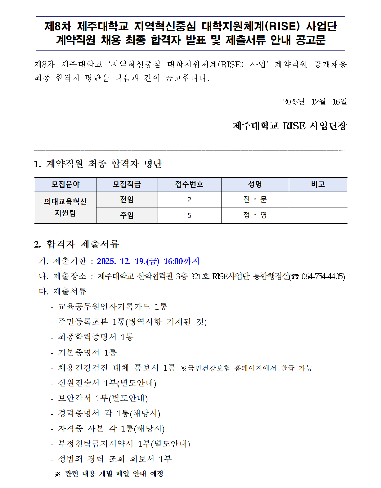 제8차 제주대학교 지역혁신중심 대학지원체계(RISE) 사업단 계약직원 채용 최종 합격자 발표 및 제출서류 안내 공고