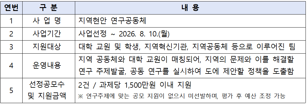 주민 참여 기반의 공동연구 체계를 구축하고자 『지역현안 연구공동체』 공모를 진행하오니, 많은 홍보와 참여 부탁드립니다.
