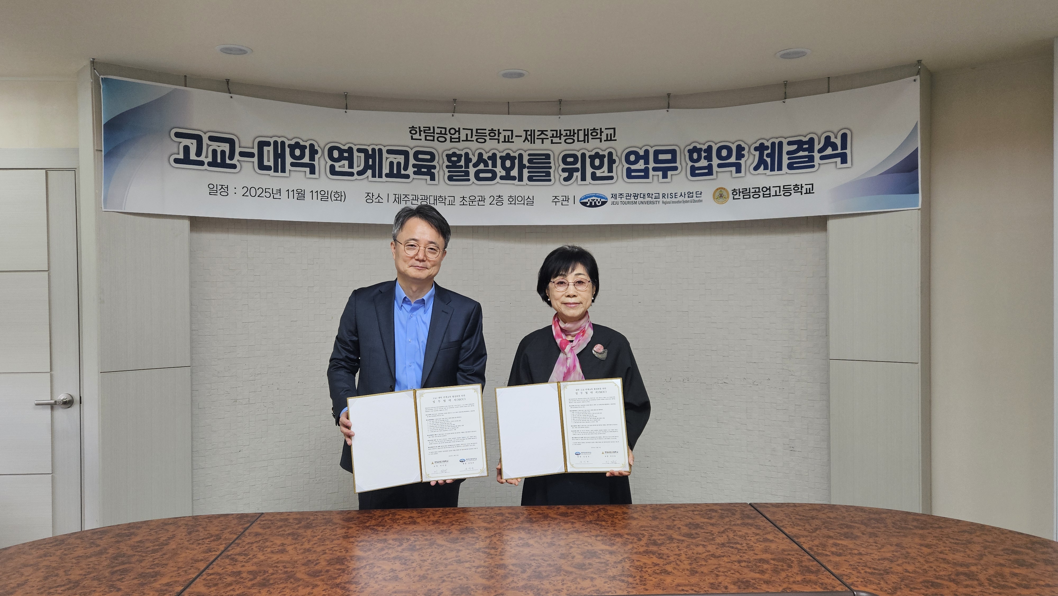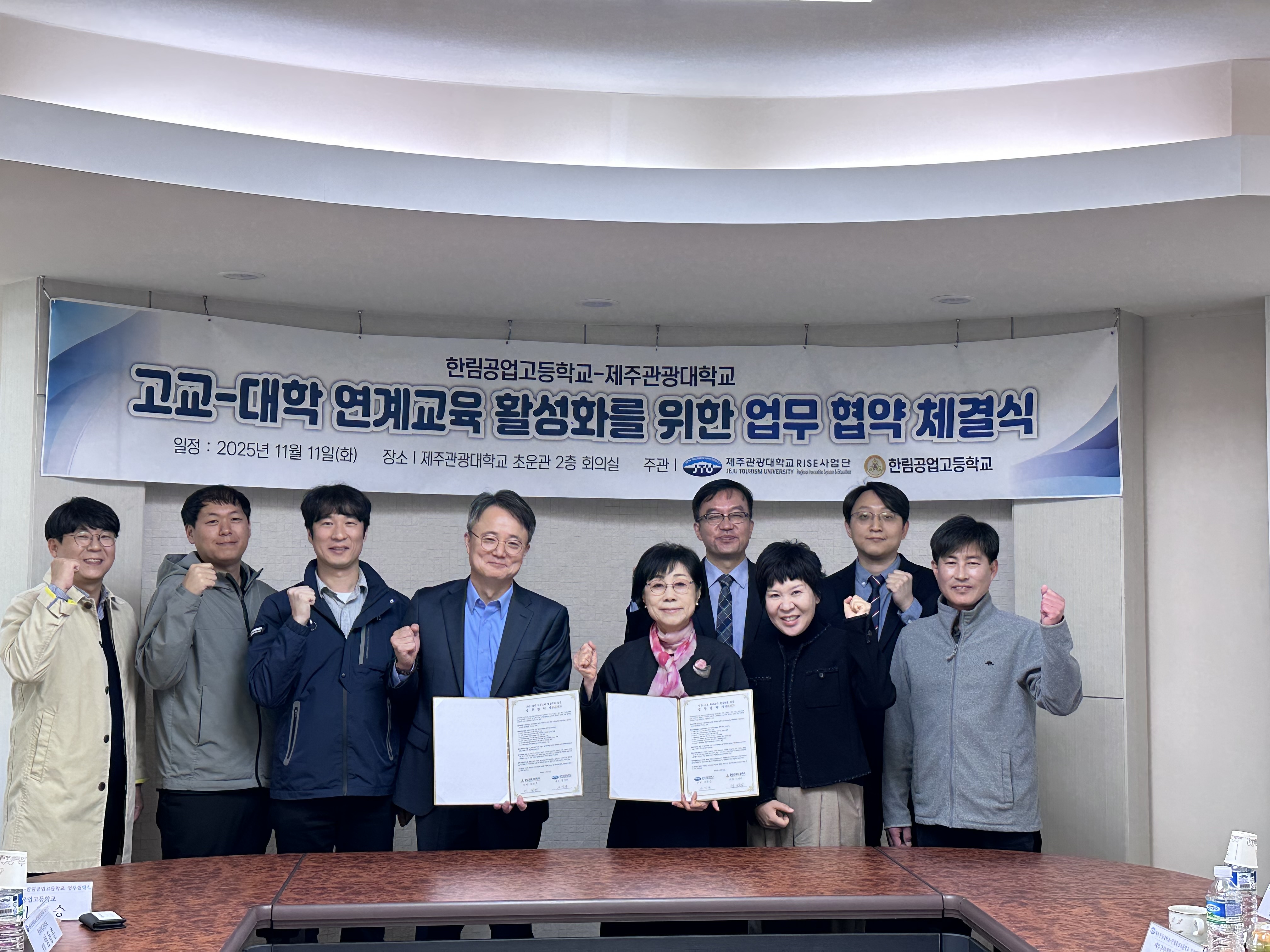 ❍제주관광대학교(총장 김성규)와 한림공업고등학교(교장 이진승)는 11월11일 제주관광대학교 초운관에서 대학-고교 연계교육 활성화를 위한 업무 협약을 체결했다.