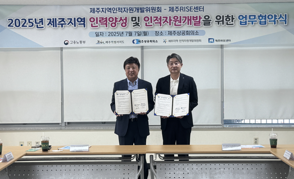 제주RISE센터(센터장 박경린)와 제주지역인적자원개발위원회(공동위원장 양문석 제주상공회의소 회장, 진명기 제주특별자치도 행정부지사)는 지난 7일 제주상공회의소에서 제주지역의 지속가능한 인재양성과 인적자원개발 상호 협력을 위해 업무협약(MOU)을 체결했다.