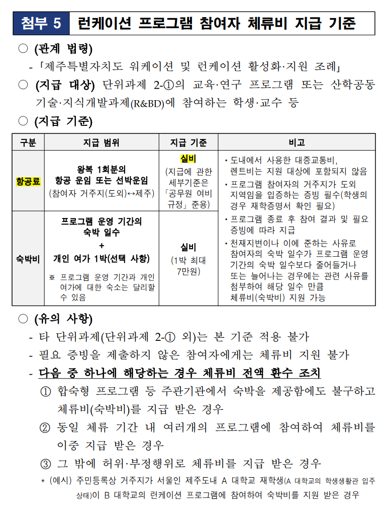 해당 사항은 「제주RISE 사업비 집행 및 관리 기준」, 첨부 5 런케이션 프로그램 참여자 체류비 지급 기준을 참고하여 주시기 바랍니다.