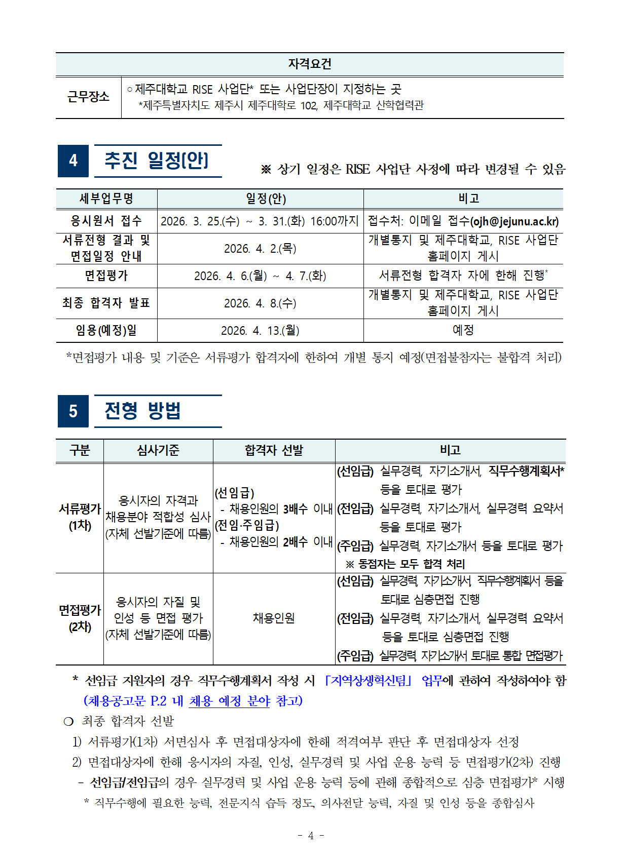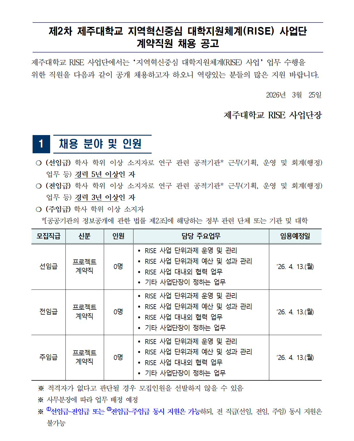 2026년 제2차 제주대학교 지역혁신중심 대학지원체계(RISE) 사업단 계약직원 채용 공고