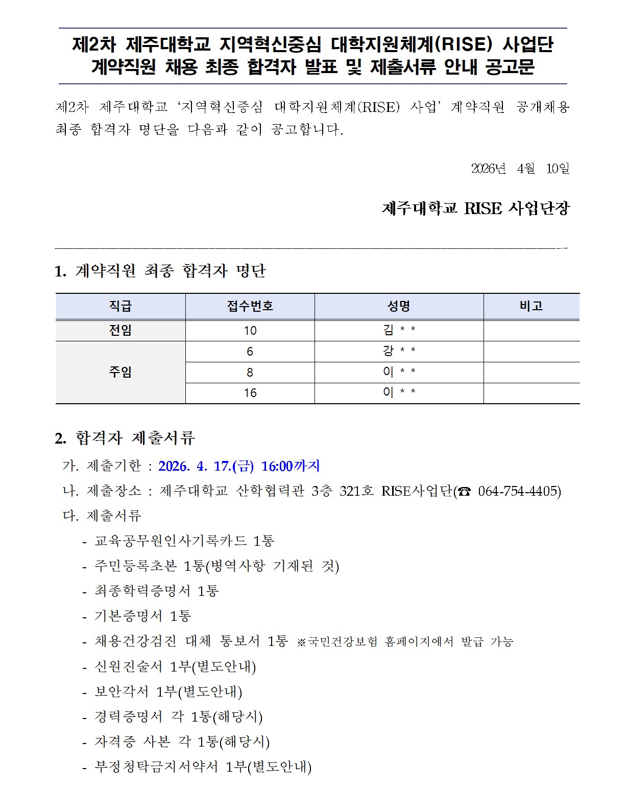 제2차 제주대학교 지역혁신중심 대학지원체계(RISE) 사업단 계약직원 채용 최종 합격자 발표 및 제출서류 안내 공고
