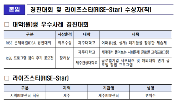한편 전국 RISE사업 참여 기관을 대상으로 한 ‘RISE-Star’ 선발대회에서는 제주RISE센터 변익수 선임연구원이 한국연구재단 이사장상을 수상하며 ‘라이즈스타 10인’에 선정됐다.